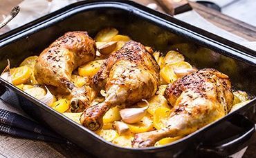 Tender and juicy chicken quarters roasted with a touch of Rosemary for full, rich flavor. Served with Savory garlic mashed potatoes and toasted garlic green beans with wine.